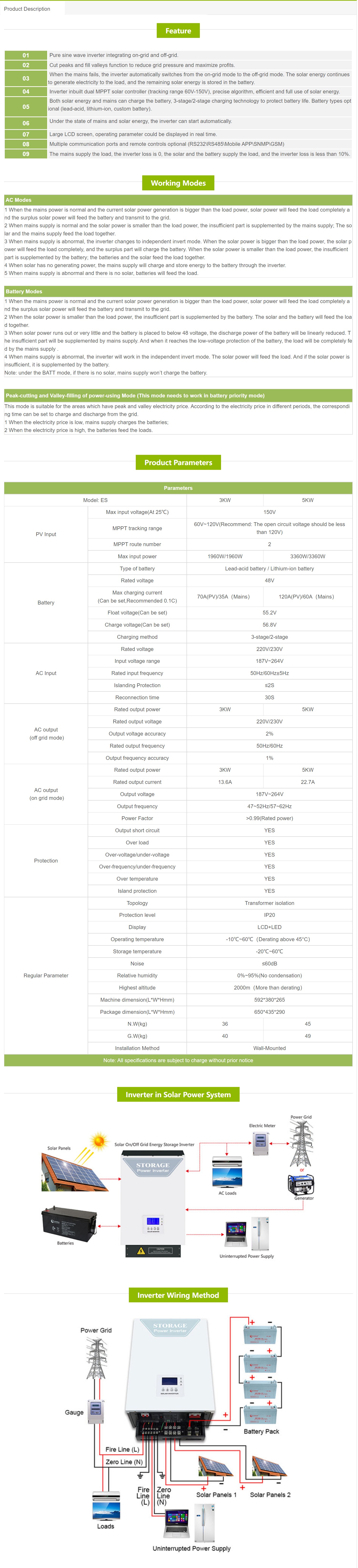 Solar On/Off grid energy storage inverter uses PV energy as priority.When the energy of PV is not enough, it can be supplemented by city power or batteries.When the PV energy is surplus, the battery is stored or accessed on the grid